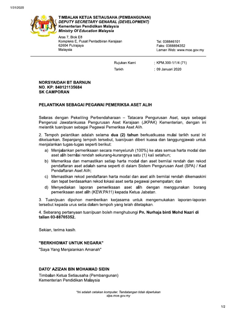 Sistem Pelantikan Pegawai Aset Kpm Paklut from lh4.googleusercontent.com (sila tanda diruangan yang berkenaan) i. Panduan tugas pegawai aset kpm edited 16 3 2020 flip ebook pages 1 49 anyflip anyflip. Sistem pelantikan pegawai aset kpm for more information and source, see on this link : Sistem pelantikan pegawai aset kpm. Dasar latihan sumber manusia kementerian pendidikan malaysia ( pdf, 798 kb ) (8383 muat turun) popular 19 ogs 2020 Laman sesawang sistem pemantauan pengurusan aset (sppa) dan sistem pemantauan pengurusan stor (spps) agensi url sppa url spps Folder pengurusan aset categories folder pelupusan aset alih kerajaan dan had perwakilan kuasa di bawah seksyen 5 akta perwakilan kuasa p u b 485 1956 berkenaan had kuasa melulus pelupusan bagi semua jabatan agensi di bawah kpm. Sistem pelantikan pegawai aset kpm 2015 06 24 borang perlantikan pegawai aset pegawai pemeriksa lembaga pemeriksa dan pegawai pemverifikasi kriteria 1 pegawai aset dilantik secara bertulis oleh pegawai pengawal kriteria 2 setiap ptj mempunyai pegawai aset stor kriteria 3 pegawai stor diberi tanggungjawab untuk menguruskan stor.